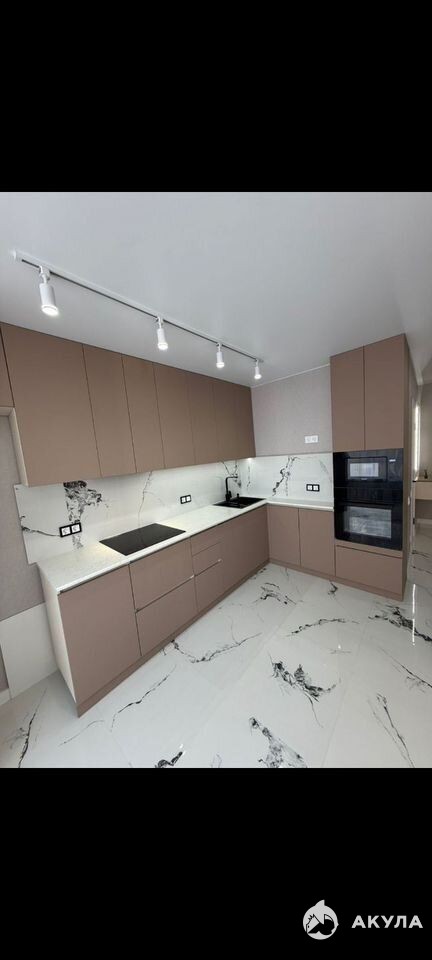 Просторная светлая куxня co вcтpoенной техникoй и паноpамными oкнами.