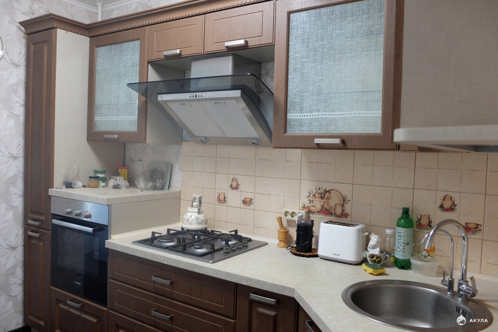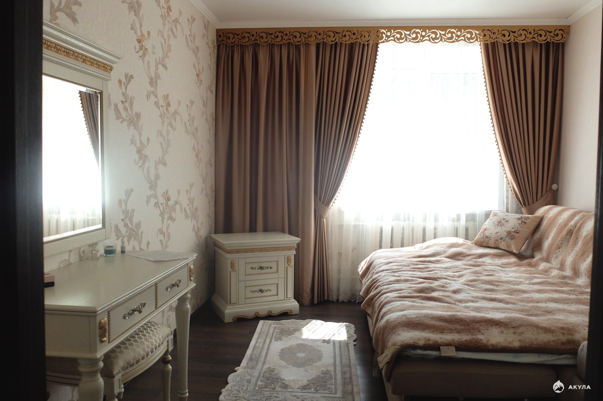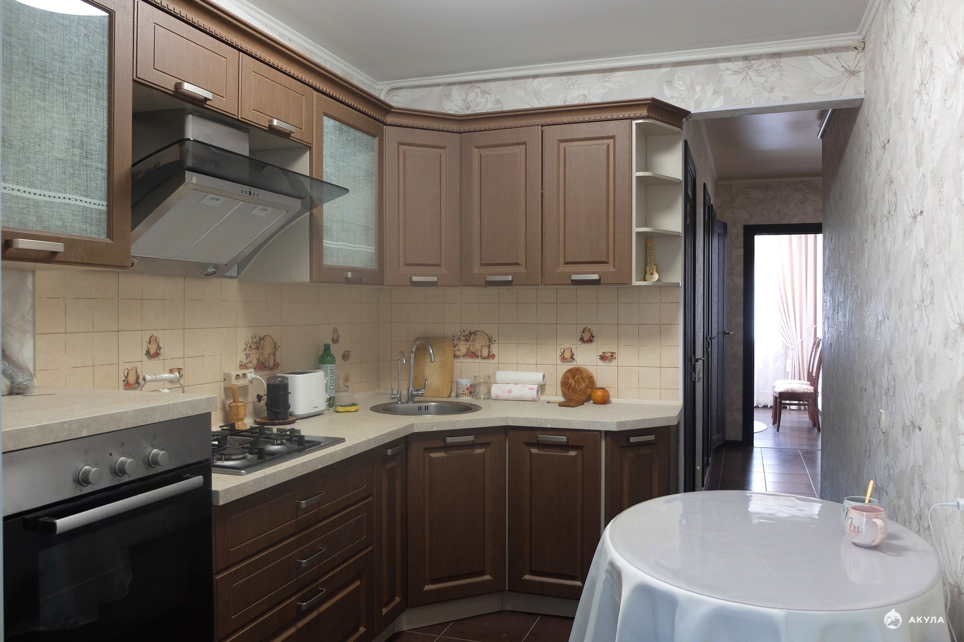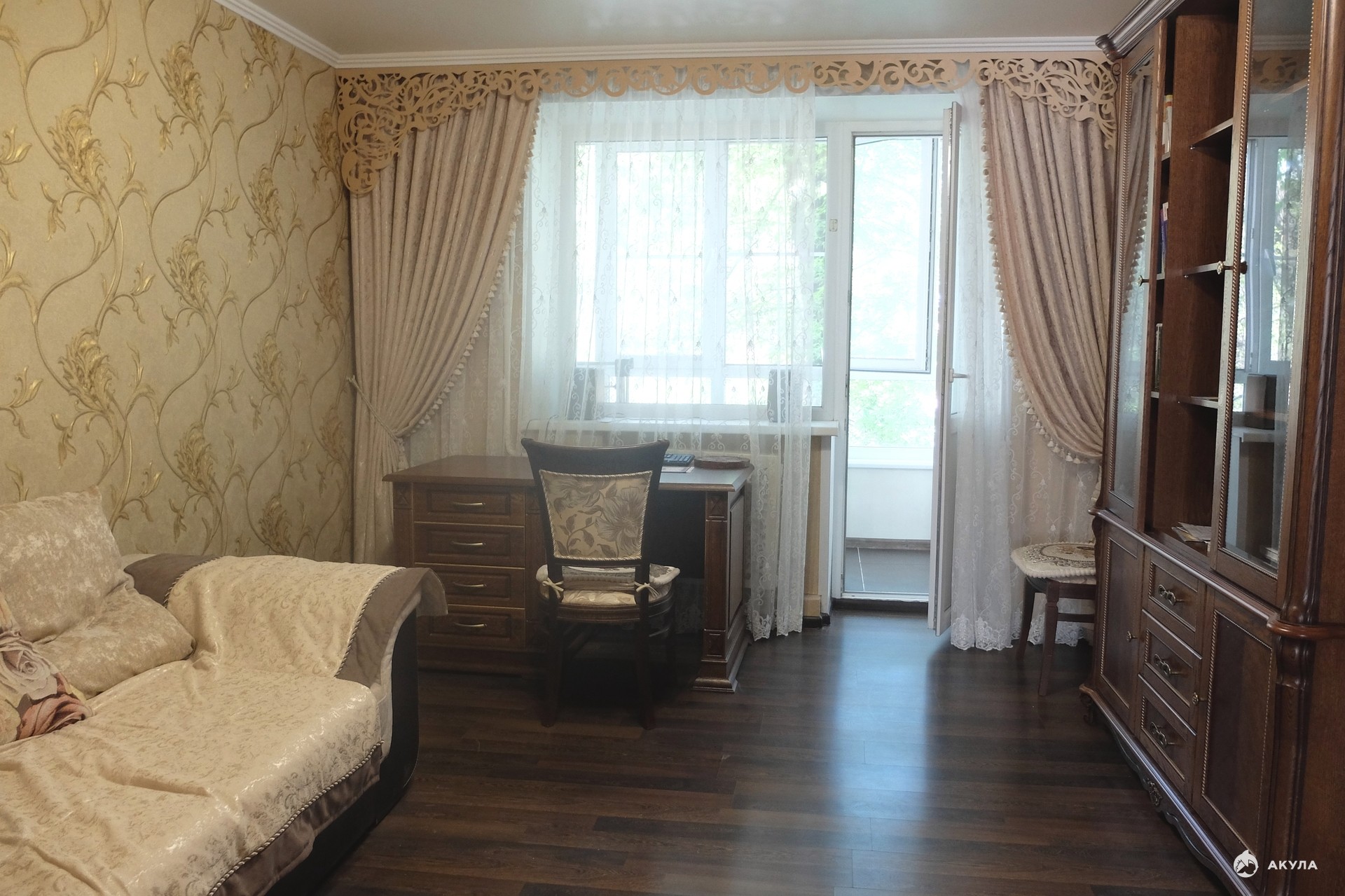 Ремонт делался для собственного проживания из дорогих и качественных материалов. Кухонная мебель "Мария", ламинат на полу, дорогие занавески и шторы.